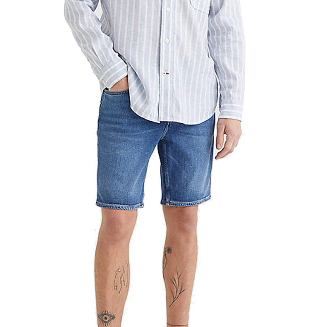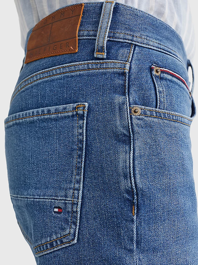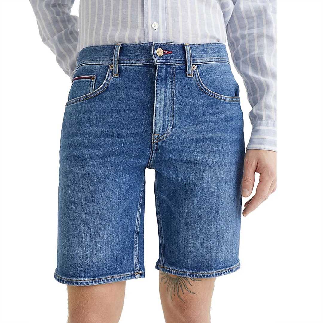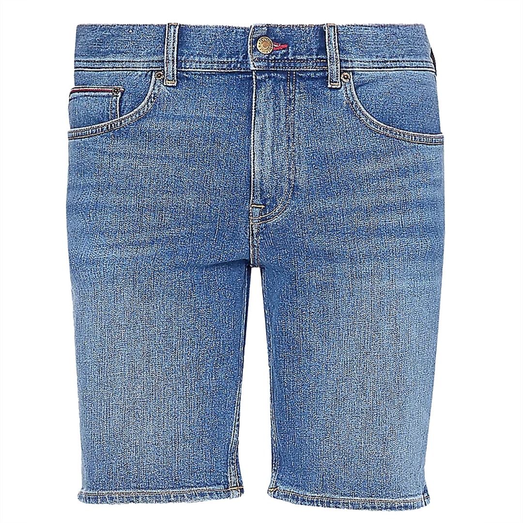 The indigo wash of the stretch cotton denim shorts, with fading on the front and seams, creates an original vintage effect. • Stretch cotton denim • Fading on legs and seams • Zip and button fastening • Five pocket styling • Tommy Hilfiger branding • Tommy Hilfiger flag embroidery on back • Regular fit