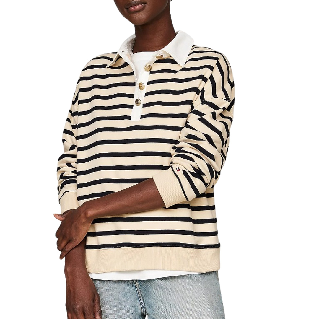 Inspired by the classic college aesthetic, this polo-style sweatshirt stands out with its elegant stripe pattern and gold buttons decorated with an embossed TH crest. Key features • Pure cotton • Yarn dyed • All-over horizontal stripes • Contrasting polo collar • Four-button placket • Ribbed hem and cuffs • Embossed TH crest on gold buttons • Tommy Hilfiger branding • Tommy Hilfiger flag embroidered on cuff Style and fit • Relaxed fit
