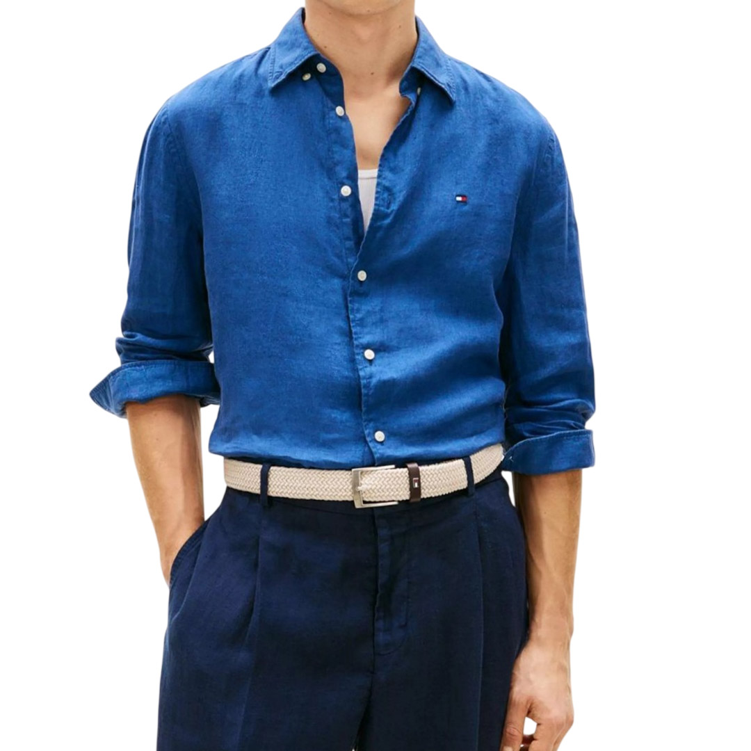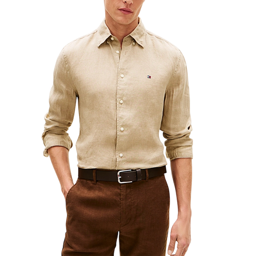 Get a retro look in this pigment-dyed pure linen poplin shirt, complete with a refined button-down collar and embroidered flag. • Pure linen poplin • Pigment-dyed • Button-down collar • Rounded buttoned cuffs • Extended back hem • Signature tape inside collar • Tommy Hilfiger branding • Tommy Hilfiger flag embroidered on chest