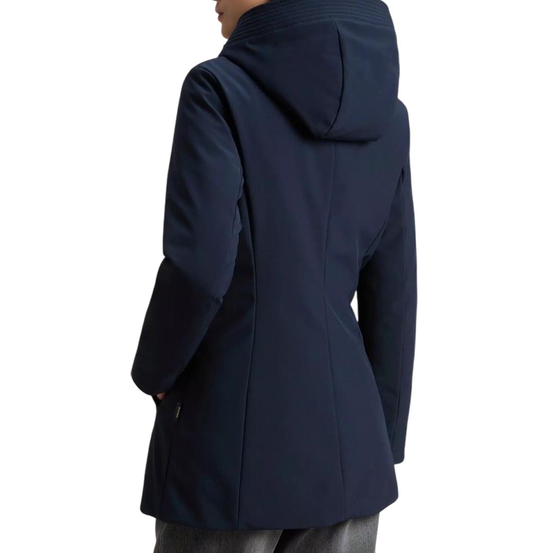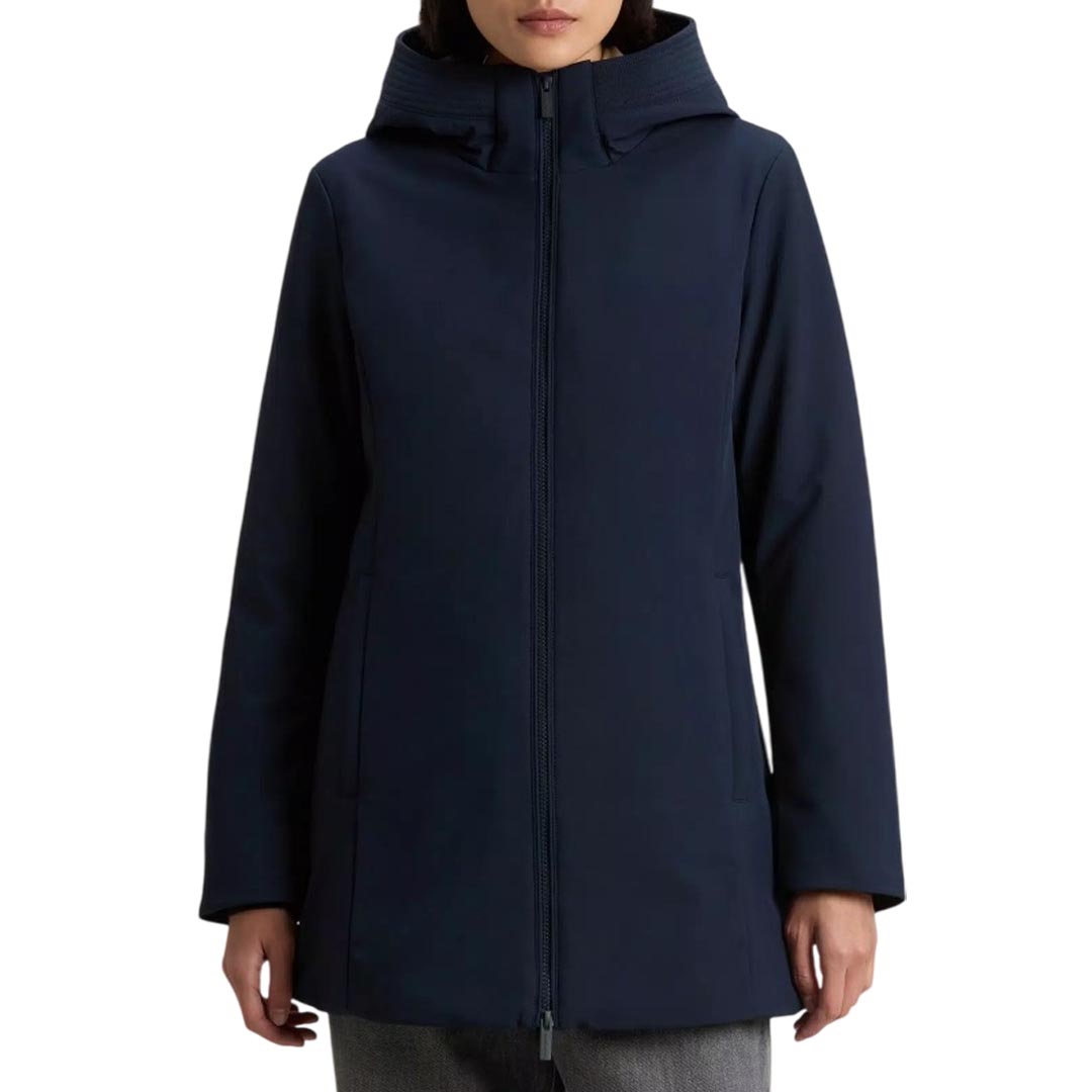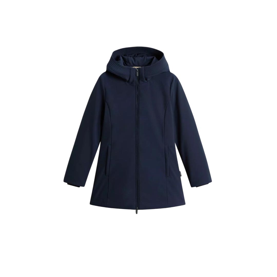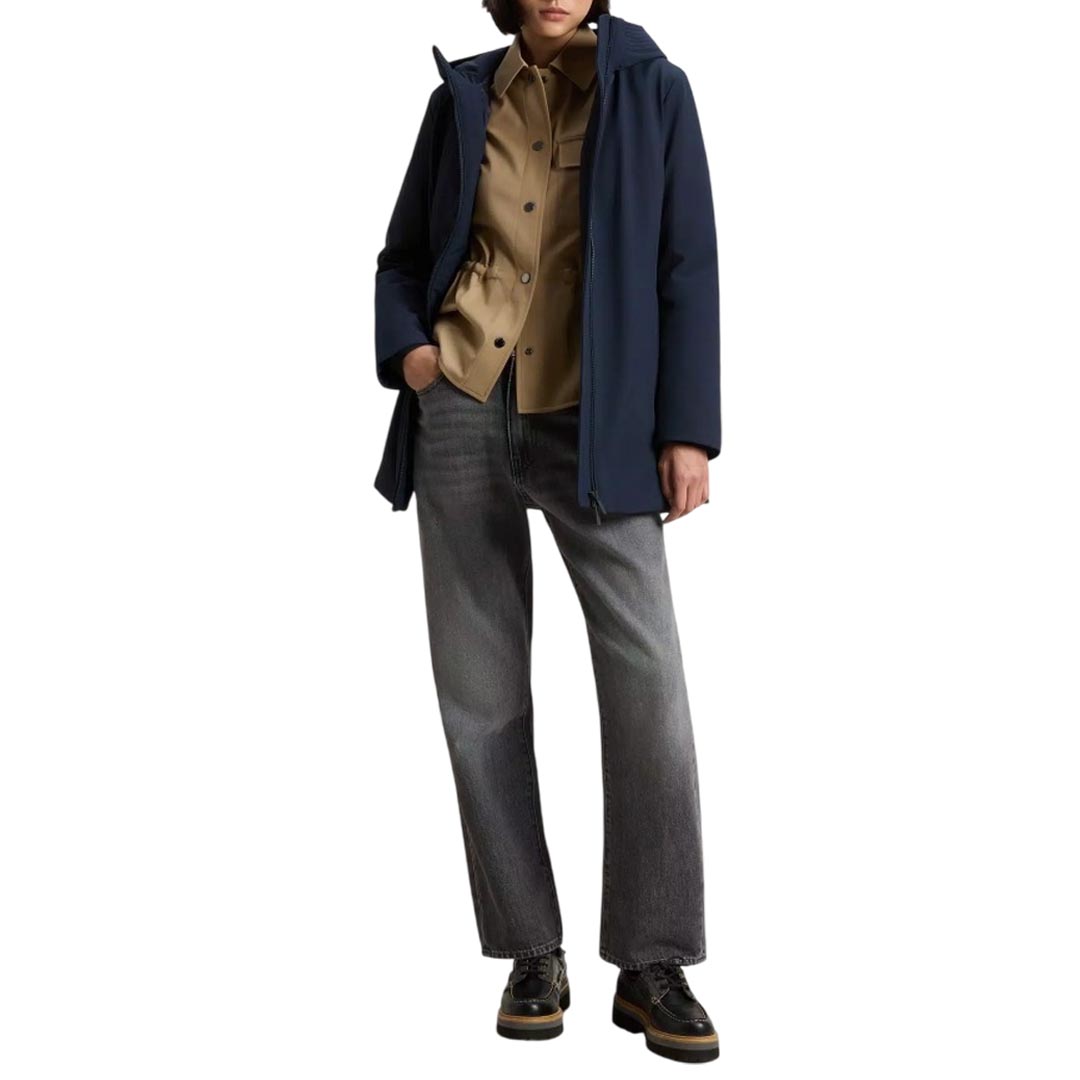 An iconic design with contemporary lines: the Firth Parka combines the elegance of Woolrich tradition with a touch of femininity, thanks to the slender silhouette enhanced by the adjustable internal drawstring waist. Made of Tech Softshell, a water-resistant and windproof fabric, it is padded with duck down and features chevron quilting on the inside. It features a hood and high collar for optimal protection, welt pockets, a convenient internal zip pocket, ribbed cuffs and a side label. Made of Tech Softshell fabric Water-resistant and windproof fabric 70/30 duck down padded RDS certified by Control Union CU 884067 Internal chevron quilting Hood High collar Two-way zip fastening Internal drawstring waist Side welt pockets with zip Internal zip pocket Ribbed cuffs Side label Slim fit