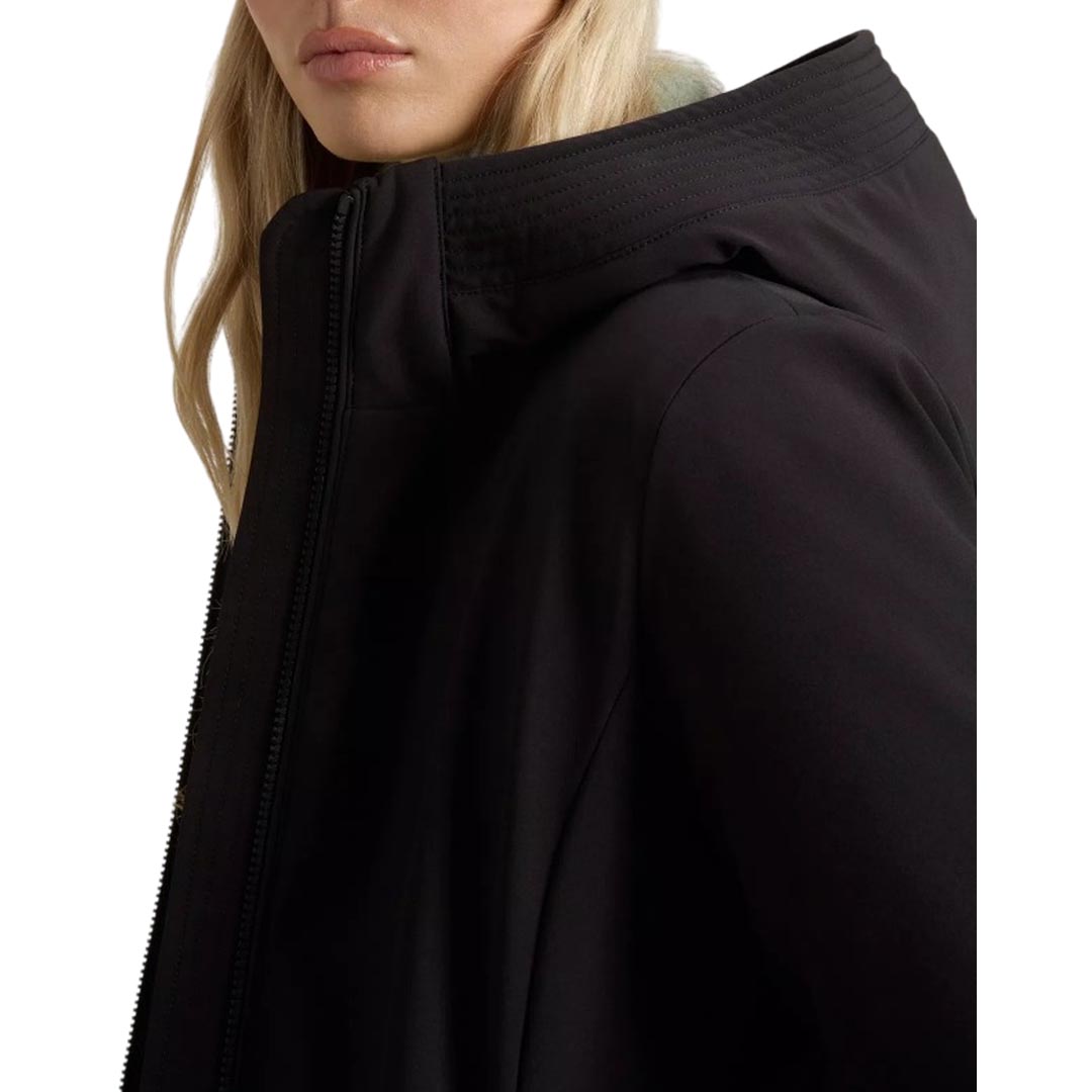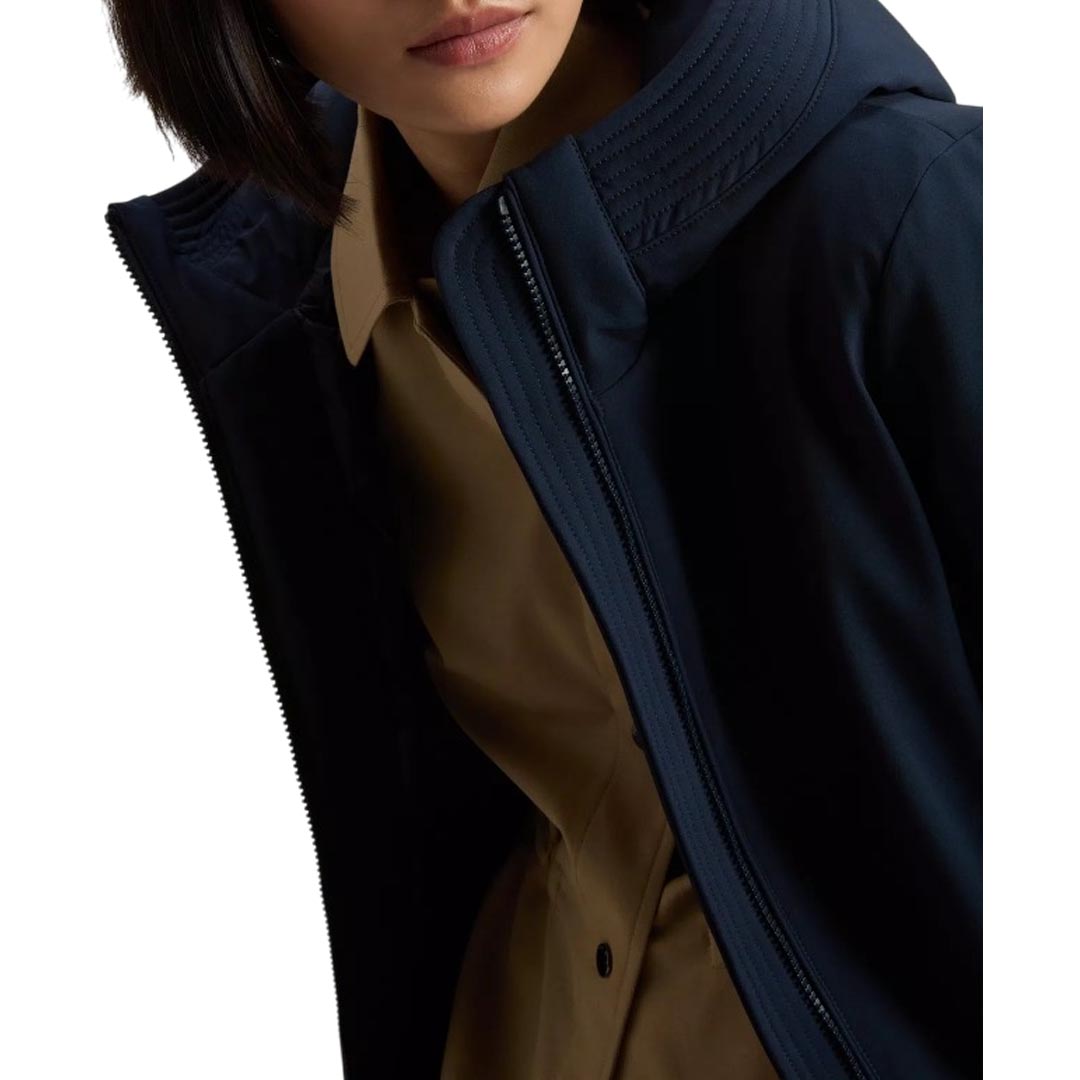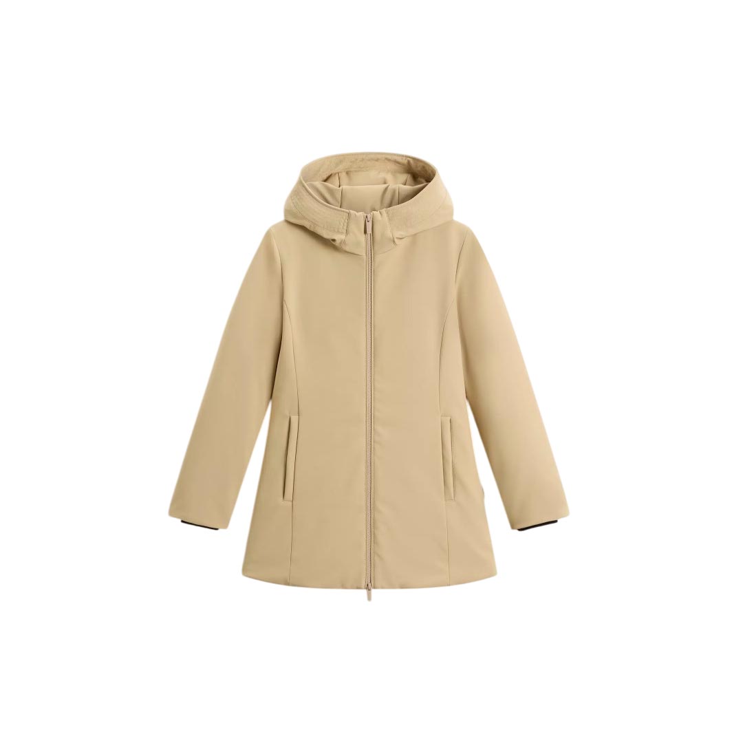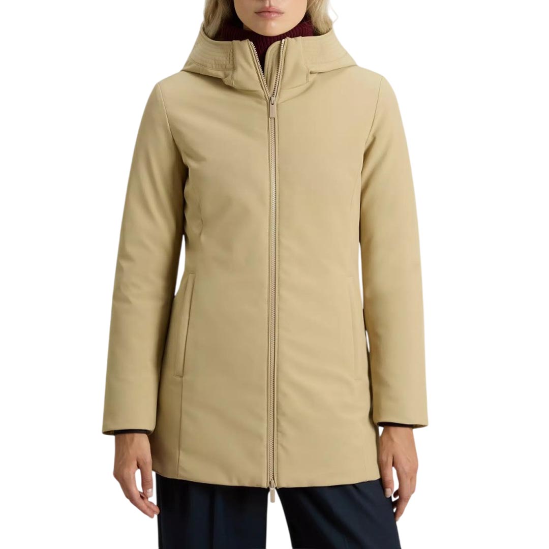 An iconic design with contemporary lines: the Firth Parka combines the elegance of Woolrich tradition with a touch of femininity, thanks to the slender silhouette enhanced by the adjustable internal drawstring waist. Made of Tech Softshell, a water-resistant and windproof fabric, it is padded with duck down and features chevron quilting on the inside. It features a hood and high collar for optimal protection, welt pockets, a convenient internal zip pocket, ribbed cuffs and a side label. Made of Tech Softshell fabric Water-resistant and windproof fabric 70/30 duck down padded RDS certified by Control Union CU 884067 Internal chevron quilting Hood High collar Two-way zip fastening Internal drawstring waist Side welt pockets with zip Internal zip pocket Ribbed cuffs Side label Slim fit
