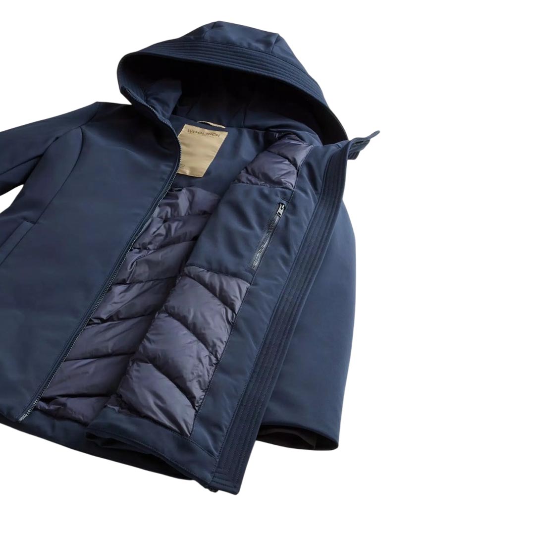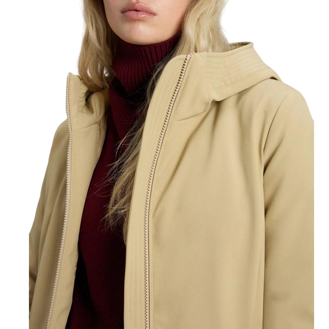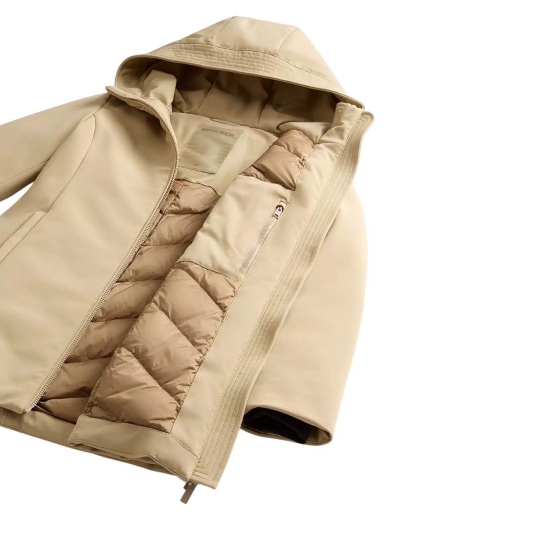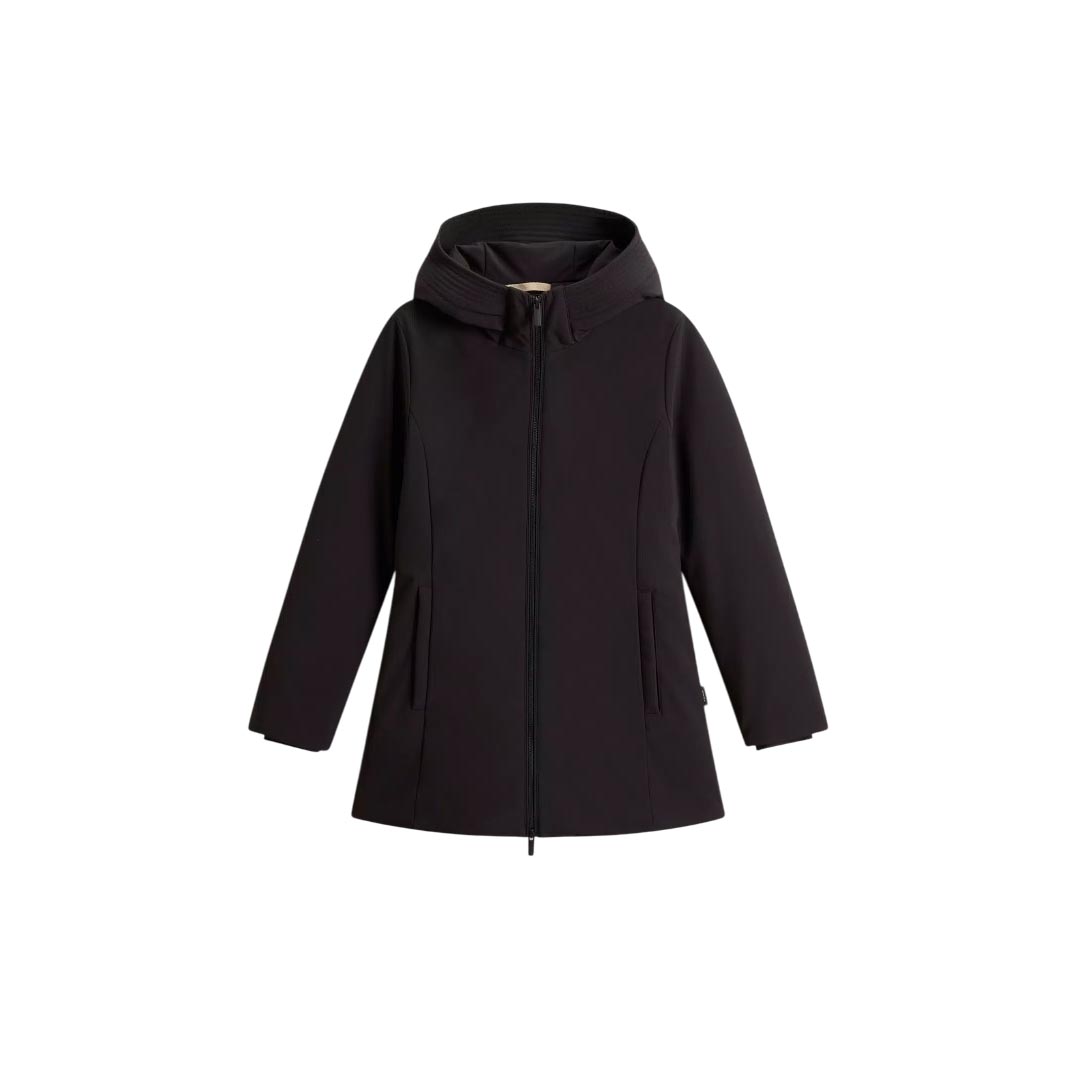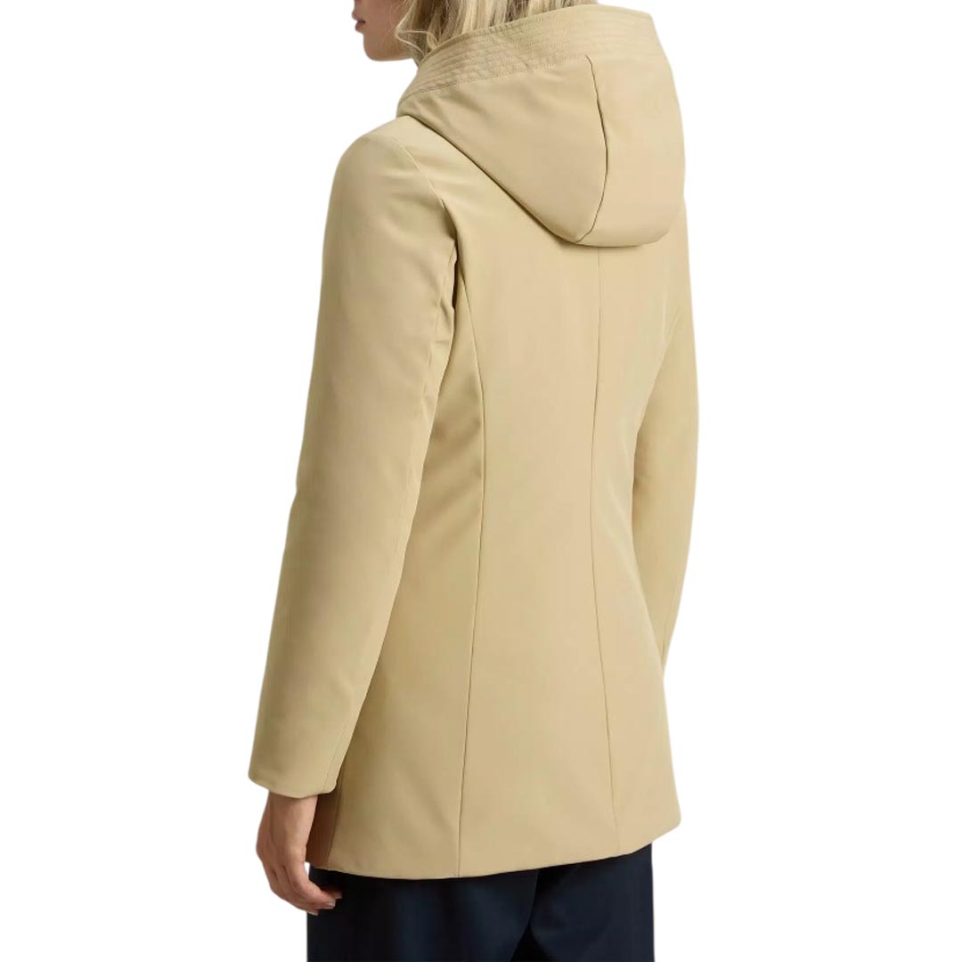 An iconic design with contemporary lines: the Firth Parka combines the elegance of Woolrich tradition with a touch of femininity, thanks to the slender silhouette enhanced by the adjustable internal drawstring waist. Made of Tech Softshell, a water-resistant and windproof fabric, it is padded with duck down and features chevron quilting on the inside. It features a hood and high collar for optimal protection, welt pockets, a convenient internal zip pocket, ribbed cuffs and a side label. Made of Tech Softshell fabric Water-resistant and windproof fabric 70/30 duck down padded RDS certified by Control Union CU 884067 Internal chevron quilting Hood High collar Two-way zip fastening Internal drawstring waist Side welt pockets with zip Internal zip pocket Ribbed cuffs Side label Slim fit